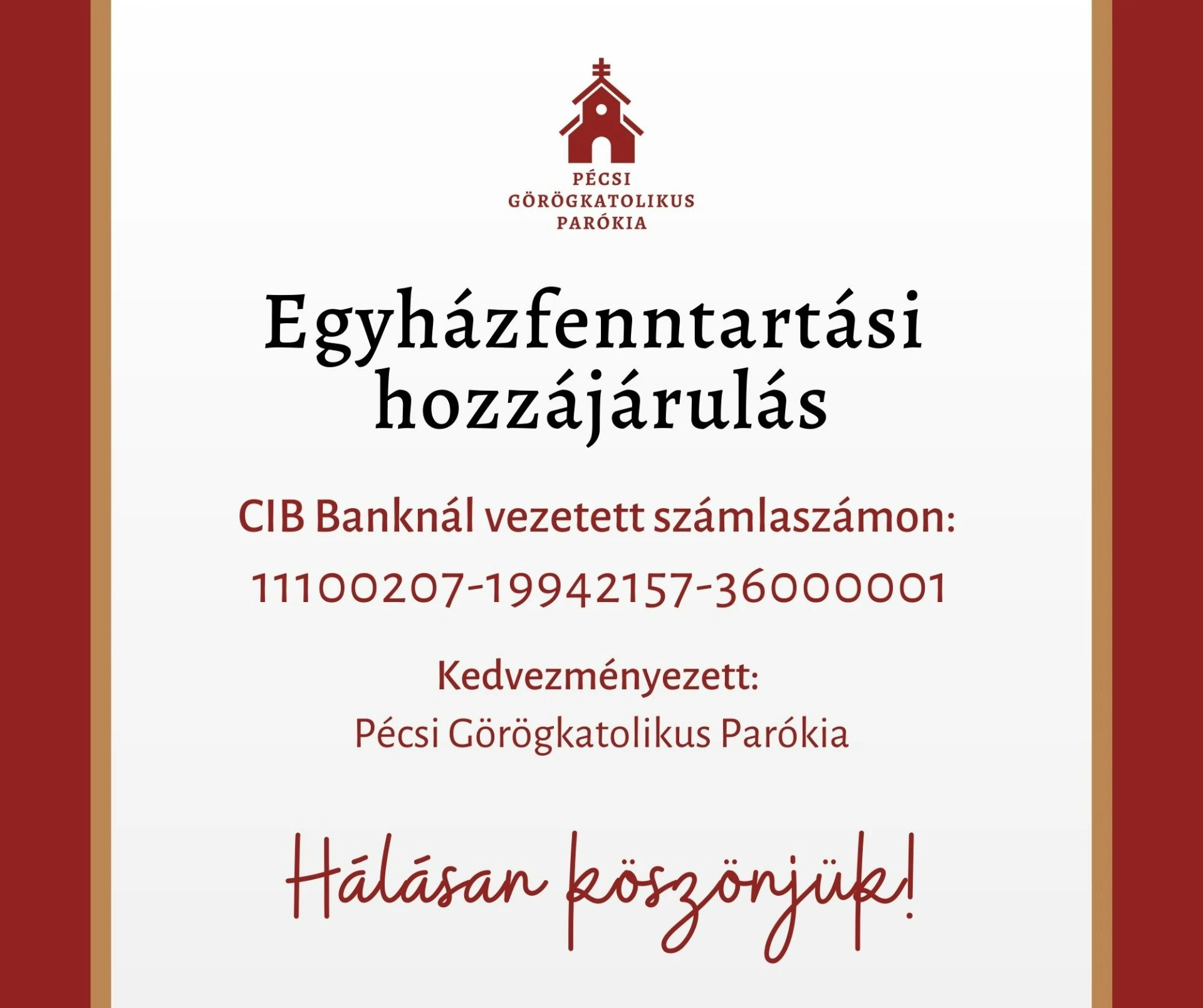 Hálásan köszönjük mindazoknak, akik ezidáig rendezték az egyházfenntartási hozzájárulásukat, melyre továbbra is lehetőség van a szertartásokat követően a sekrestyében vagy átutalással a következő számlaszámra:
