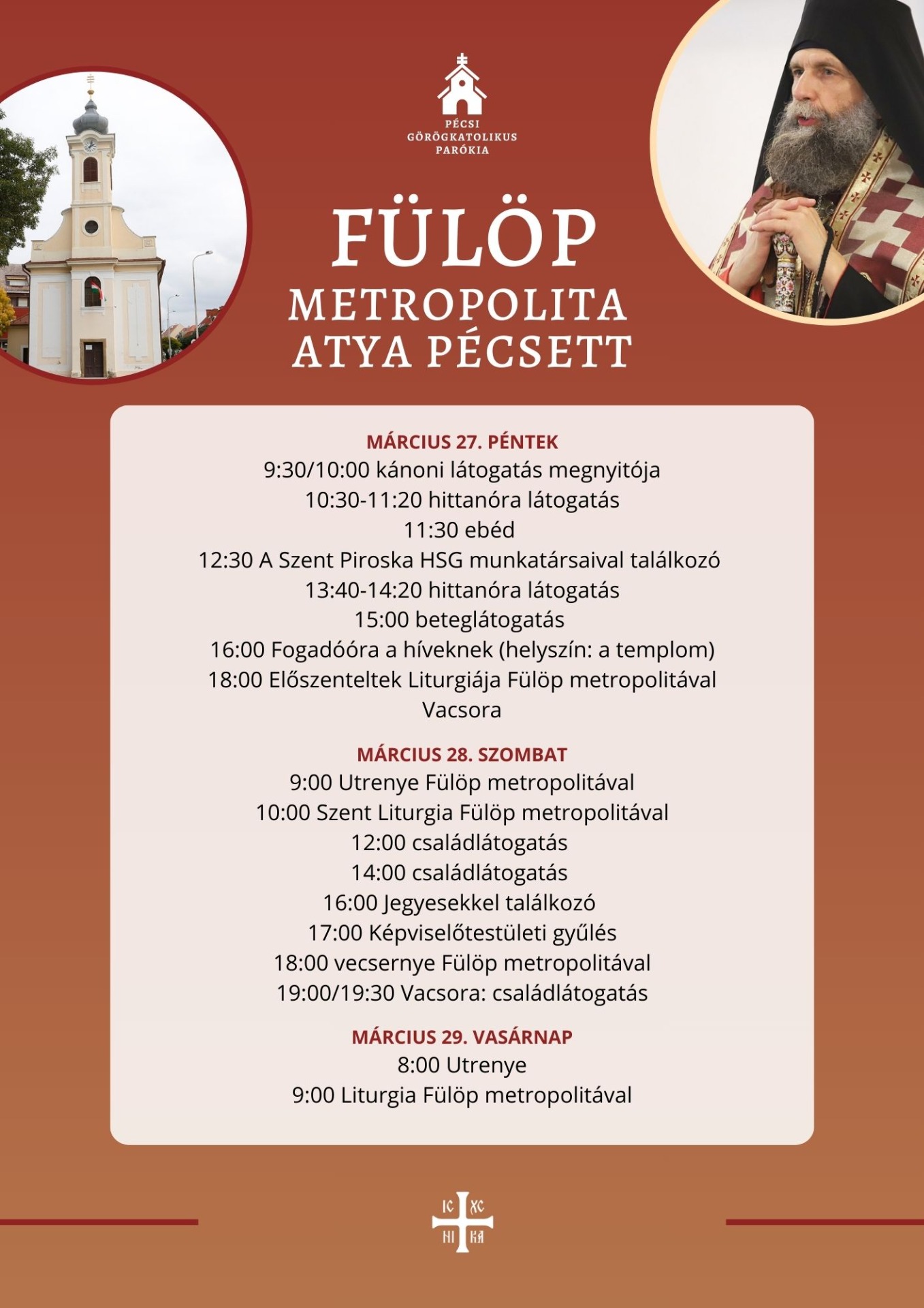 Egyházközségünket az a tisztesség érte, hogy március 27-29. között kánoni vizitációt tesz Fülöp érsek metropolita a Pécsi Görögkatolikus Parókián, így a szertartások időpontjai a következők szerint alakulnak: