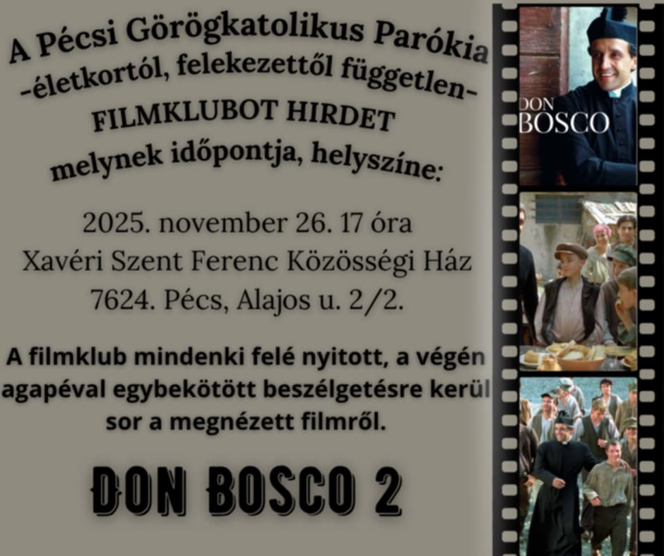 Akinek ideje, kedve engedi, csatlakozzon, jöjjön el november 26-án 17.00-ra a Pécs, Alajos utca 2/2-be, gazdagodjunk együtt! A következő alkalmon a Don Bosco életéről szóló film második részét nézzük és beszéljük meg.