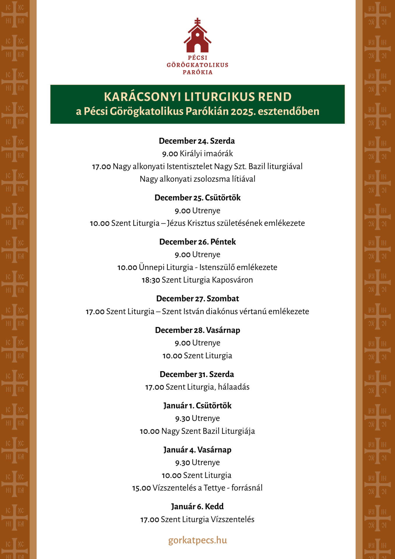 Karácsonyi Liturgikus rend a Pécsi Görögkatolikus Parókián 2025. esztendőben
