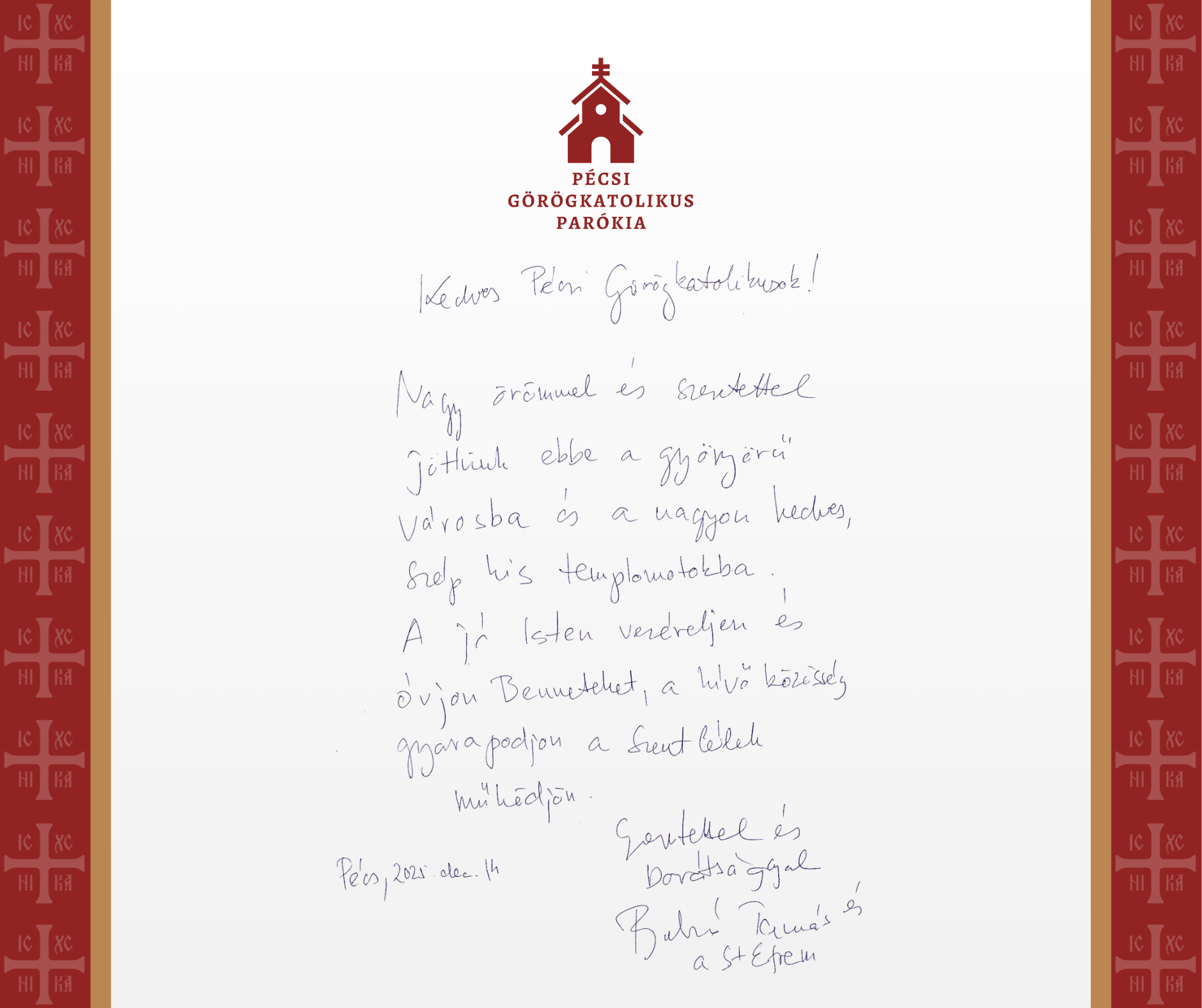 2025. december 13-án érkezett meg a Győri Görögkatolikus Egyházközségből a Szentháromság-ikon a mi egyházközségünkbe. Az ikon átadását követően Főtisztelendő Tasi Tamás győri parókus atya értékes útravaló gondolatokkal tette gazdagabbá ünnepi készületünket.